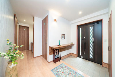 お客様を気持ちよくお迎えできるよう、玄関横にクローゼットを設け、玄関はいつもすっきりと片付くように工夫しました。