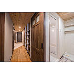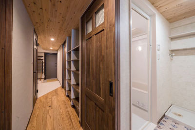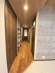 玄関から入って右側の部屋の壁を壊し、玄関から続く開放的な趣味室に変更。天井は無垢の杉材、壁はエコカラット、窓は内窓で調湿効果を考えました。