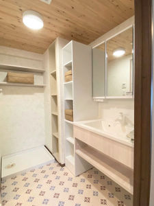 洗面所の天井は調湿効果のある国産の無垢材。壁にエコカラット。お風呂上がりの湯気も気になりません。造付けの収納棚と洗面化粧台にスペースができたので、幅30㎝のキャビネットを追加、更に収納スペースが増えました。