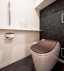 「蓋の銅色が決め手」とご主人。クロスと床は奥様のチョイスで、ホテルのような高級感あるトイレに。