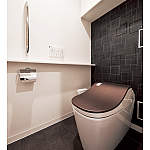 「蓋の銅色が決め手」とご主人。クロスと床は奥様のチョイスで、ホテルのような高級感あるトイレに。