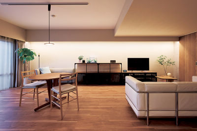 壁側の梁は垂れ壁を造作して隠し、間接照明をプラス。美しい光のラインが浮かび上がり、空間をあたたかく照らしながら、スタイリッシュな印象を与えます。カーテンボックスは垂れ壁のラインと合わせて造作。壁をくり抜いて作ったかのような一体感のあるデザインに。綿密な色彩計画と直線を活かした空間設計でインテリアを整理し、広がり感と落ち着き感を両立。ご夫婦ふたりが豊かに暮らせるシンプルで美しい住まいが生まれました。