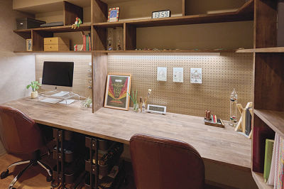 隠れ家のようにこもれて集中できる書斎スペース。ふたり並んで作業ができます。カウンターやたっぷり収納できる本棚を造作。