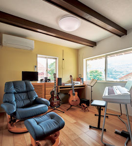 充実した時間を過ごせる、音楽スタジオ。アクセントウォールや梁などでお部屋に個性が生まれました。