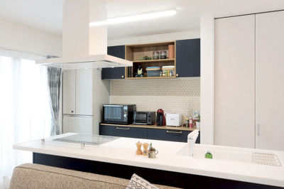 カタログを見てひと目で気に入ったネイビーブルーのカップボード。ベージュ色の変形タイルを合わせて、より個性的でお気に入りのキッチンに。