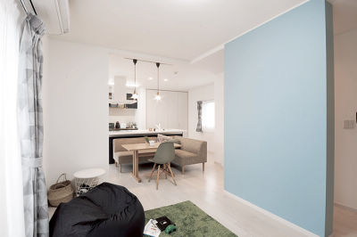 耐力壁を淡いブルーにしてお部屋のアクセントに。写真を撮るときの背景にも活躍しているそう。