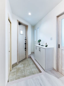 白基調で仕上げた玄関ホールとの調和を考え、階段の蹴込み部分を白い木材で仕上げています。