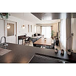 キッチンは重厚感あるカウンターと美しい木目の面材が引き立つようリビング向きの対面型に。家族の顔を見ながらお料理を楽しめるようになりました。周囲はホワイト系でまとめ、カントリー調だったLDKをスタイリッシュに。キッチンが一層際立つ空間になりました。