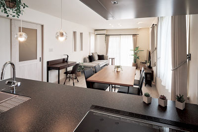 キッチンは重厚感あるカウンターと美しい木目の面材が引き立つようリビング向きの対面型に。家族の顔を見ながらお料理を楽しめるようになりました。周囲はホワイト系でまとめ、カントリー調だったLDKをスタイリッシュに。キッチンが一層際立つ空間になりました。