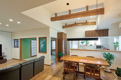 お子様の独立を機に、ご夫婦で心地よく過ごせる空間にとLDKを一新されたK様。ご希望だった明るさ・開放感を実現するために、キッチンをL型から吊り戸棚のないI型対面式に変更し、ダイニングを広めに確保。さらにリビングとダイニングの間にあった引き戸と垂れ壁をなくし、LDKをひとつながりの空間に仕上げています。横方向の広がりだけでなく縦方向への開放感も叶えているのが、解体工事で現れた旧居の美しい梁。その佇まいの美しさに感銘を受け、急遽プランを変更。現しにした梁を際立たせるため、天井を折り上げることでデザイン性の高い空間を生み出しました。「どこにいても気配と声が届くから、お互い好きなことをしながら会話も楽しめます」とK様ご夫婦は心豊かな日々をお過ごしです。