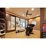 透明ガラスの大型間仕切りでリビングとインナーガレージをひとつの空間に。調光調色可能なダウンライトでシーンに合わせてバイクの表情が楽しめます。
