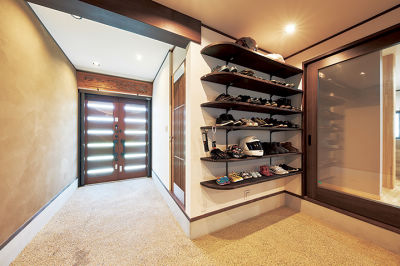 玄関アプローチの床は洗い出しで和の高級感を。靴は造作棚でオシャレな“見せる収納”に。