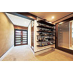 透明ガラスの大型間仕切りでリビングとインナーガレージをひとつの空間に。調光調色可能なダウンライトでシーンに合わせてバイクの表情が楽しめます。