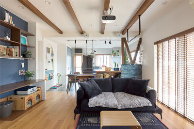 時代や生活の変化に伴って、この先も愛犬と一緒に楽しく暮らしたいと、思い切ってリフォームされたI様。和室をなくし、1階をワンフロアの大きなLDKに。キッチンの向きを変えてⅡ型にしたことで、「前は孤独に料理をしていたけれど、テレビを見たりおしゃべりしながら家事ができる」と、奥様も満足されています。取れない柱や筋交いと梁を同色で塗装して一体感を持たせ、大きな窓にはウッドのルーバーを。家具やクロスのネイビーをアクセントに、“木”とバランスのいい上品な空間に仕上げました。
