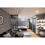 LDKと寝室は縦格子で、ゆるやかな区切りを。収納ではなくコレクションを楽しむための自在可動棚を設置。