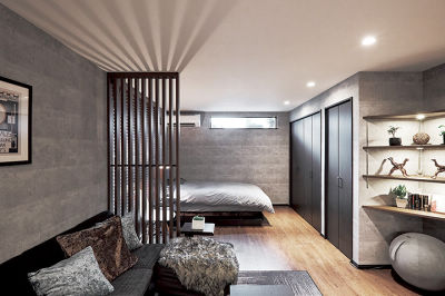 キッチンは自らカフェの厨房に立つH様が使い慣れた厨房機器を選択。メタルな質感が映えるアイランドスタイルに。開放感を高めるためLDKに隣接する寝室の壁は、縦格子の建具でゆるやかに仕切りました。照明はすべて集光タイプで、陰影のある空間を演出。コンクリート調の壁は、年を重ねても違和感のない色調のものを選び、落ち着いた印象に仕上げました。
