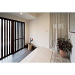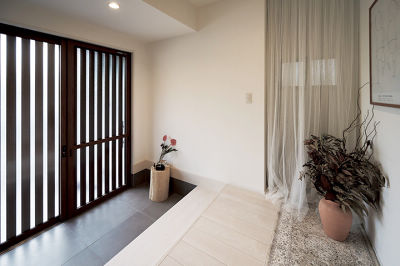 明るくなった玄関。奥様お気に入りの60㎝角の土間タイルはポーチからひと続きで高級感を。