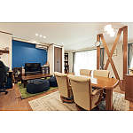 耐震性向上のため補強した筋交いは、内装に合わせて塗装。ブルーのアクセント壁上部にはスクリーンを設置しています。
