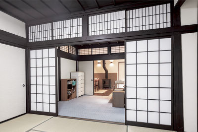 建物の趣をできるだけ残したいというご要望に、大勢の親族が会した馴染み深い二間続きの和室の配置はそのままに、欄間障子は空間のアイコンとして再生。お母様が歩行器でも移動しやすいように、LDKはバリアフリーに配慮した洋室に。梁をあらわにした勾配天井は上方向への新たな表情を生み、柱と梁は塗装して落ち着いた古民家調を実現。