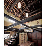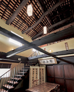 リビングへとつながる吹き抜けの玄関ホールは奥様たってのご希望。土間を改修したこの空間は、2階の床板を外して葺き替えた屋根の裏まで見えるようにし、迫力のある開放感で訪れた人を迎えます。また、以前の面影を感じられるように、建具や瓦、梁、鯉のぼりの竿まで使えるものは積極的に再利用しました。