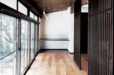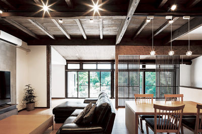 いつか使いたいと取っておいた縦格子を有効活用。断熱性を改善し、広いLDKでもエアコン1台で夏も冬も快適。