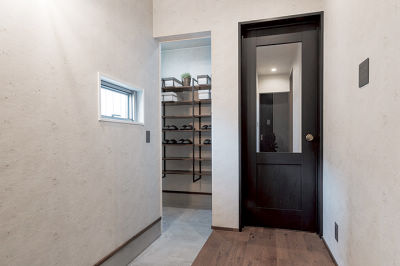 帰宅後、ウォークスルーの土間収納に靴・カバン・上着類を置き、そのまま洗面室へ。衛生面でも安心です。