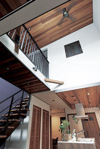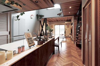 オールドアメリカンを意識した床や木の天井をはじめ、アイアンの階段やネイビーの壁、レンガの装飾など、リビングにはご主人のこだわりが満載!趣味のアイテムに囲まれて、家族団らんを楽しめる住まいになりました。