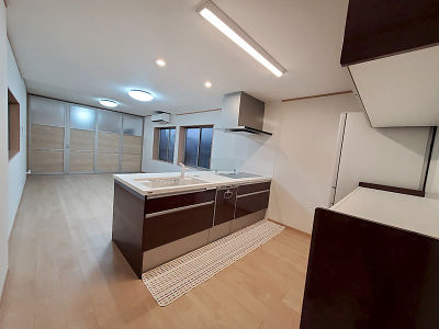造作壁を取り払い、より開放感のあるキッチンになりました。ボルドーのキッチンをアクセントとした和モダンな空間にしました。