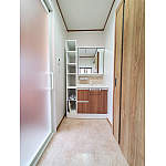 洗面化粧台は浴室と同色のチェリー×モザイクベージュを採用しました。サイドにトールラックを組み合わせ、使い勝手の良い洗面スペースとなりました。