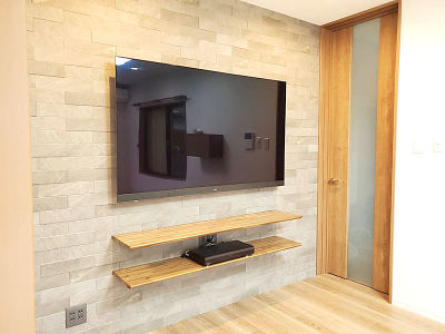 リビングのTV背面は調湿+脱臭機能がある内装材を貼りました。お部屋のアクセントと共に生活臭やペットの気になるニオイ対策としても◎