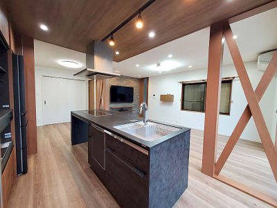 構造上外せない柱は筋かい表し仕上とした事で強度を維持しつつも開放的なLDKとなりました。