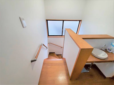 2階の降り口に洗面ボウルを設置。すぐに手洗いが出来て安心です。階段には手すりを取り付け、安全性も向上しました。