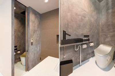 色味と風合いにこだわったトイレの便ふたとオリジナルの真鍮を使ったドアがラグジュアリー感を演出。