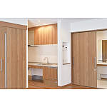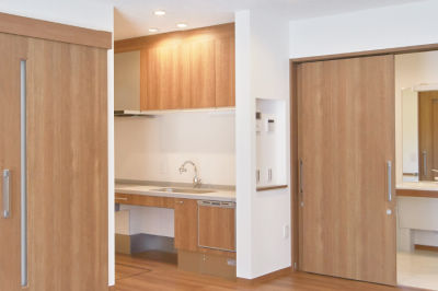 水廻りへの扉は三枚連動引き戸。部分的に閉められるので、介助中のプライバシーにも配慮できるようにしました。