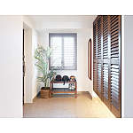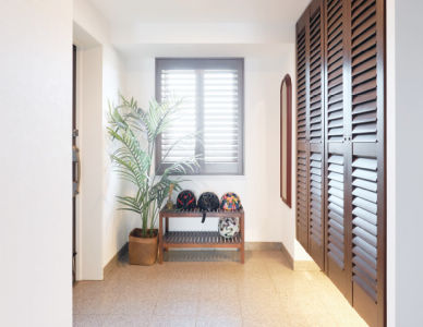 玄関の窓に木製のルーバー式建具を設置。リゾート感の演出とともに通風の確保や湿気対策にも役立っています。