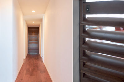 太めのウッドルーバー付きの建具で上質なハワイアンテイストを演出。扉を閉めていても西日対策をしながら風が通ります。