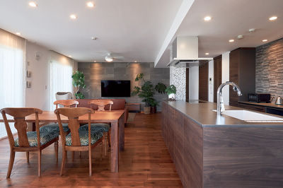 ハワイ旅行がお好きなH様はご自宅をリゾート感のある空間へ全面リフォーム。LDKはより広がりを感じられるよう壁や天井の凹凸を整えてスマートに。素材感が異なる建材をアレンジしハイセンスな空間に仕上げました。動線やレイアウトも見直してスタイリッシュさと使いやすさを両立しました。