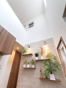 上がり框を斜めに配置することで、より広くなった玄関ホール。