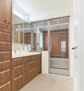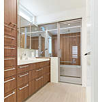 チェリー柄で統一した洗面室と浴室。浴室ドアとFIX窓に透明面材を採用し、ホテルライクな雰囲気に。