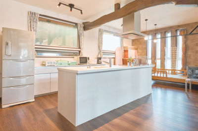 定年をきっかけにご実家を明るく広い空間にし、住みながらT様ご自身で手を加えられる部分を残してリフォーム。間仕切りを取り払い、2階の床も撤去して吹き抜けに。家の中心から陽光が降りそそぎ北側のキッチンも明るくなりました。筋交いは開放感生まれる鉄筋製に。DIYで自由な空間づくりを楽しめます。