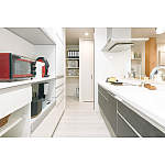 家事動線にこだわり、回遊できるアイランドキッチンに。大型のカップボードには調理家電やゴミ箱をまとめて収納できます。
