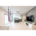 LDKの中央に、奥様ご希望の空中ヨガ用のハンモックを設置。お子様がブランコ代わりにして遊んだり、楽しみいっぱいの空間に。