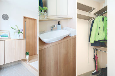 帰るとすぐに手を洗うことができる洗面台や土間クローゼットなど、機能面も充実。