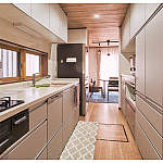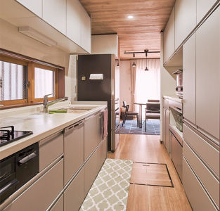 親世帯のキッチンは、廊下からもダイニングからも出入りでき家事の効率化をあげる、回遊動線にこだわっています。