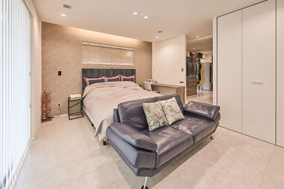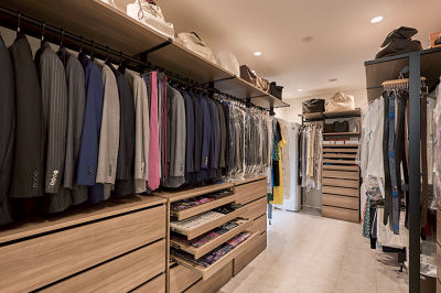 衣類やバッグ、小物など、収納物の種類と量に合わせて、収納棚や引き出しを組み合わせ。洋服選びが楽しくなり、隣接した寝室への動線もスムーズに。