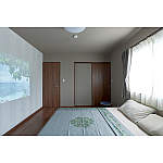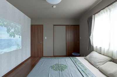映画鑑賞を楽しめる寝室。上品なベージュの壁紙に貼り替え、一面だけプロジェクターを投影させるため白壁に。