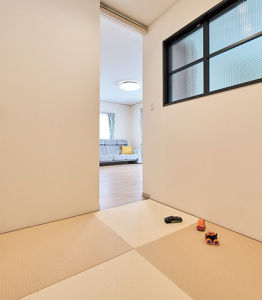LDKに隣接する約2帖の畳コーナー。お子様の遊ぶ様子がキッチンから見えるように配置しました。