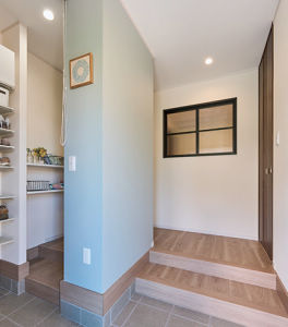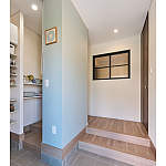 広い玄関ホールにはシューズクロークを新設。正面の壁に設けた室内窓は、光を採り込み、空間のアクセントにもなります。