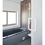 落ち着いたカラーの高級感のある浴室。窓は複層ガラスを採用。寒い冬でもあたたかく。