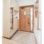 飾り棚付きの玄関収納。お出かけ前にさっと身だしなみをチェックできるミラーが便利。